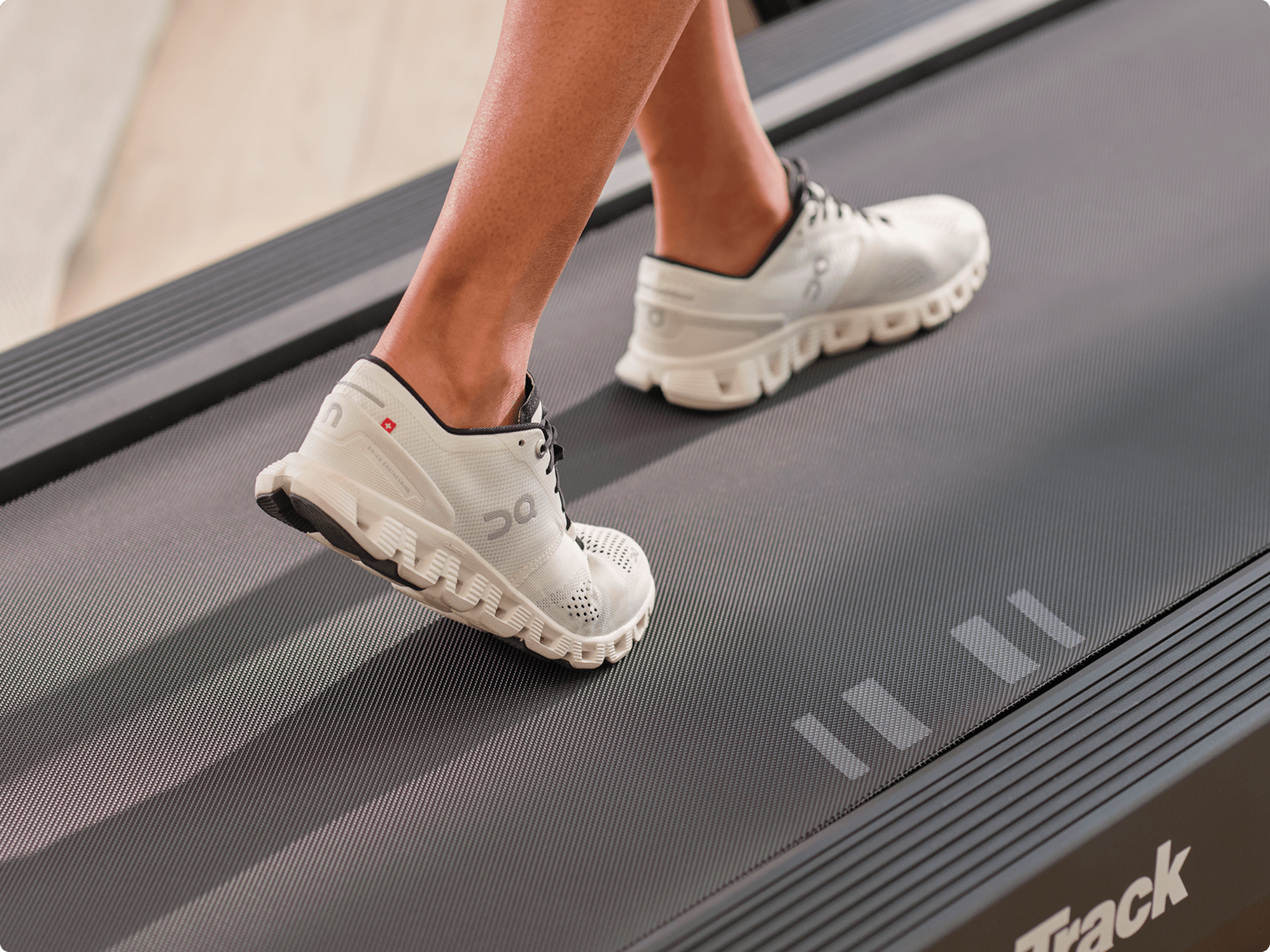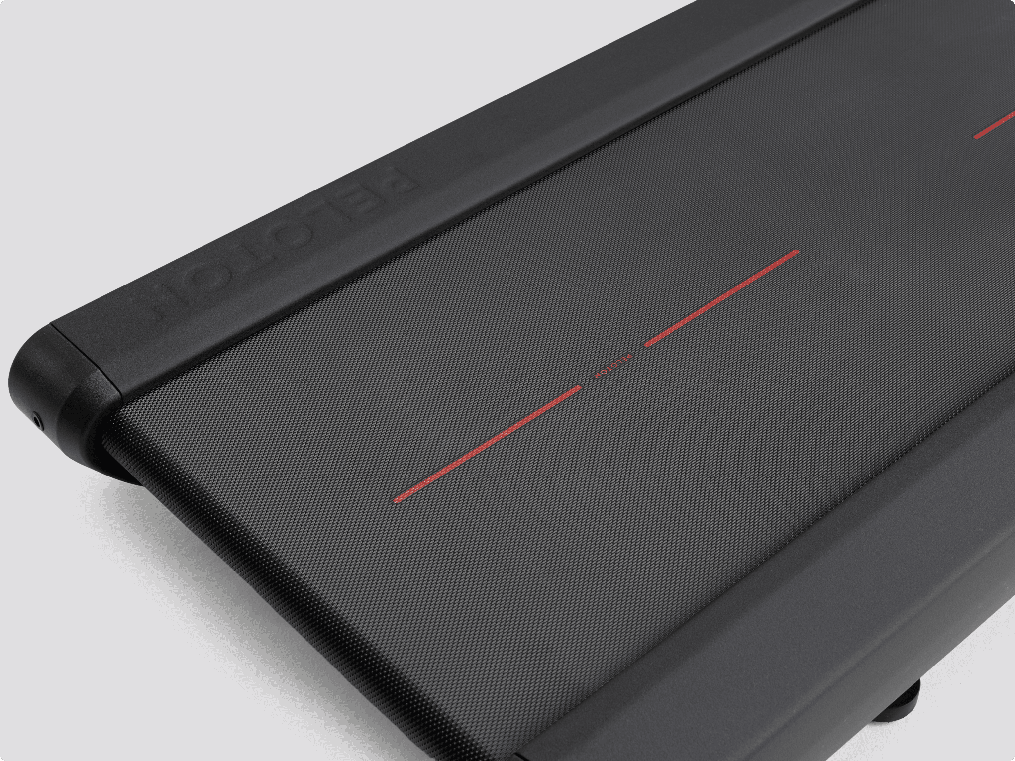 Peloton Tread has a textured running belt with a red centered line.